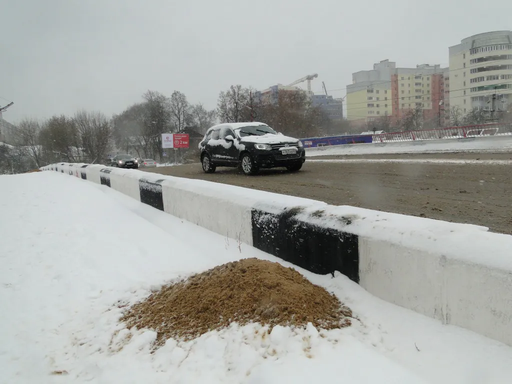 В Рязани после двух ДТП на Горбатом мосту дорогу посыпали песком – фоторепортаж