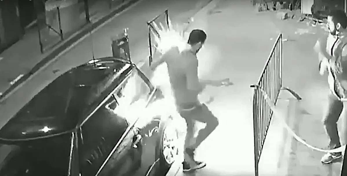 Действие происходило у входа в ночной клуб. В ролике видно, что Бритель использует электронную сигарету, а затем убирает ее в карман толстовки. Внезапно устройство воспламеняется, и у мужчины загорается одежда. После долгих попыток при помощи друзей ему удается сбить пламя и выкинуть искрящийся испаритель. Причиной взрыва, предположительно, стало короткое замыкание китайского аккумулятора.