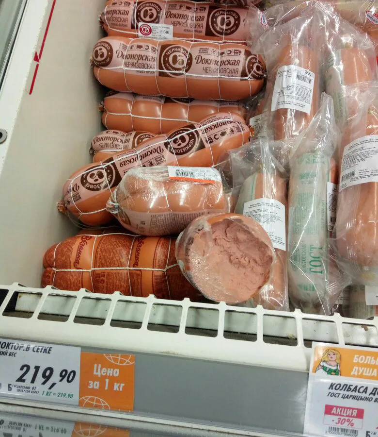 Рязанка обнаружила в ТЦ "Глобус" откусанную колбасу.  Девушка сфотографировала мясной продукт и выложила снимок в социальную сеть.