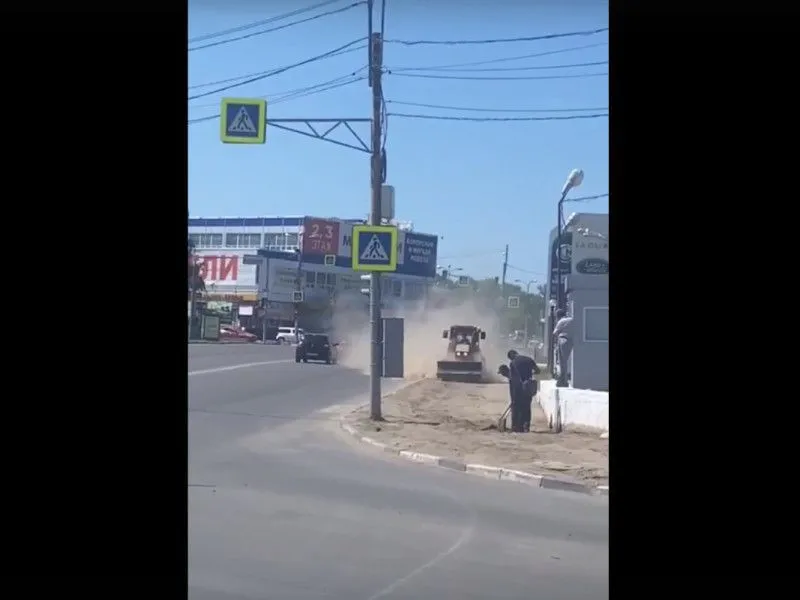 На записи запечатлено проведение дорожных работ, в ходе которых вокруг разносятся клубы песка.