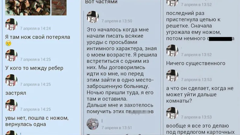 По данным издания, следователи обнаружили в переписке одной из подозреваемых признания в том, что она заманивала мужчин в заброшенное здание крематория и пытала их ножом. Так, в одном из сообщений она рассказала, что «потеряла нож у кого-то между ребер». Позже она подтвердила это на допросе.