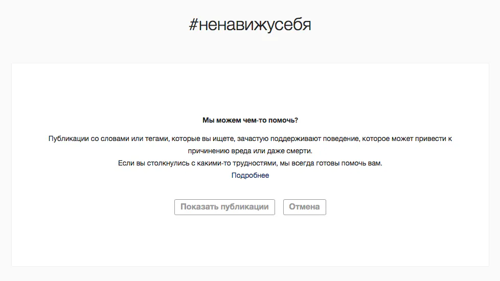 Такое сообщение выдает Insyagram при поисковом запросе по тэгу #ненавижусебя, к сожалению это крайне зыбкий барьер.
