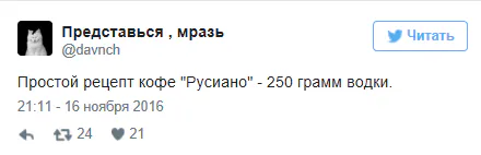 Видимо, мало кто знает о новом приколе, новостями интересуются не все. Но, если посетители начнут спрашивать, есть ли в меню "русиано", напиток обязательно появится , - поделилась официантка Анастасия. - Но я к такому предложению отношусь отрицательно. Рецепт этого кофе был придуман в Америке, отсюда и название. Пусть тогда в России придумают новый рецепт кофе и назовут его "русиано".
