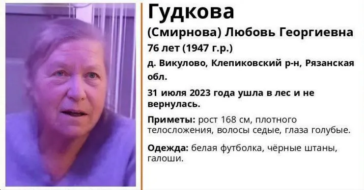 Любовь Гудкова родилась 1947 году. На момент исчезновения женщина была одета в белую футболку, чёрные штаны и галоши того же цвета. Известно, что рост женщины составляет около 168 сантиметров, у неё плотное телосложения, голубые глаза и седые волосы. Полезную информацию о местонахождении Любови Гудковой можно сообщить в ближайшее отделение полиции или по телефонам 112 и 8(800)700-54-52. К поискам пропавшей уже подключились сотрудники правоохранительных органов, однако требуется помощь добровольцев.
