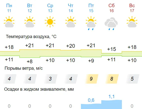 В понедельник, 11 сентября, рязанцев ждет малооблачная погода. Столбик термометра не превысит +18 градусов Цельсия. Со вторника, 12 сентября, по пятницу, 13 сентября, в городе потеплеет. Температуры воздуха днем составят от +20 до +21 градуса Цельсия. В выходные: 16 и 17 сентября, в Рязани станет прохладнее. В субботу, 16 сентября, в Рязани столбик термометра покажет днем: +15 градусов Цельсия. В воскресенье, 17 сентября, в городе станет теплее днем на 3 градуса. Порывы ветра усилятся под конец недели. Максимальный ветер будет дуть в пятницу, 15 сентября, и в субботу, 16 сентября. Минимальная скорость ветра в среду, 13 сентября, составит три метра в секунду.