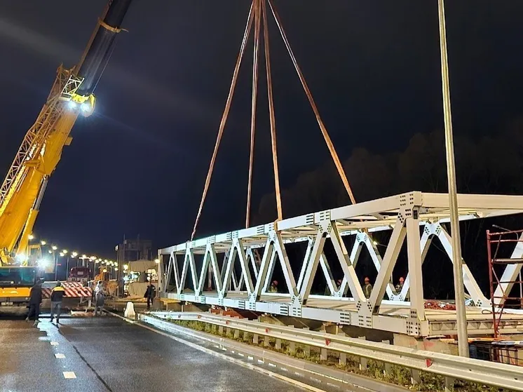 Надземный переход организовали рядом с Борковским карьером. Для того, чтобы установить конструкцию моста ночью 16 октября на Северной окружной дороге полностью перекрывали движение транспортных средств.
