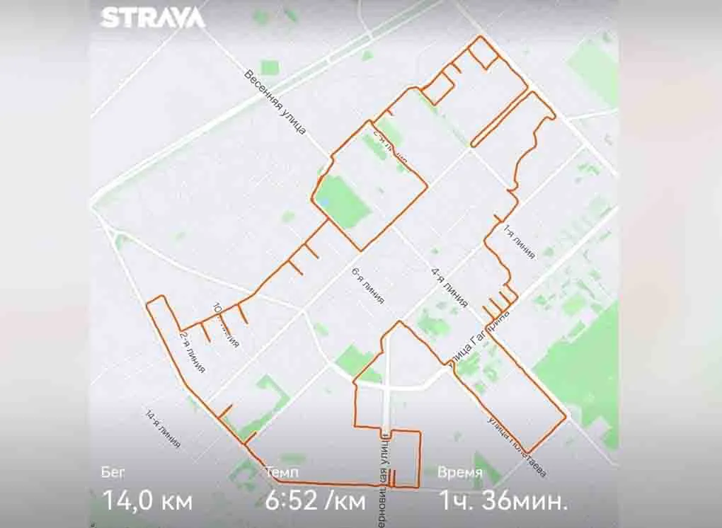 После 14-километрового забега по заранее намеченному маршруту появился рисунок, который изображает собаку на фоне карты города. Стоит отметить, что дистанцию Абрамова преодолела за 1 час 36 минут.