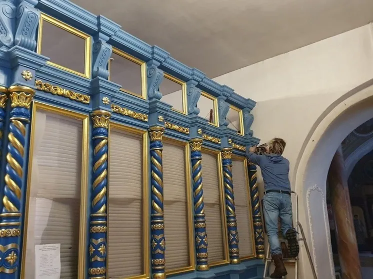 Отмечается, что иконостас выкрасили в темно-синий цвет и украсили позолоченным декором. Денежные средства на проведение реставрации собирали прихожане храма: сбор стартовал в июле и продолжается до сих пор.