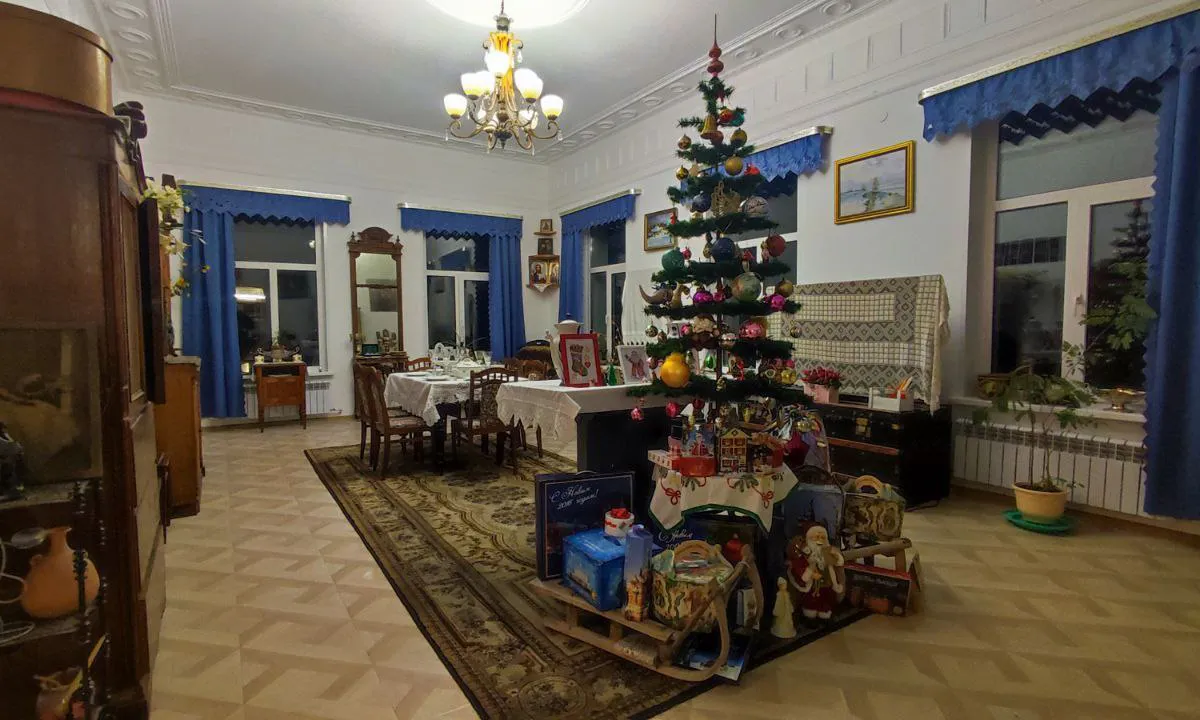 Дом с характером – это купеческая усадьба XIX века, которую он ранее посещал летом. За это время историк, меценат и владелица усадьбы Татьяна Алимова с ее помощниками провели ремонт в некоторых комнатах. Татьяна Дмитриевна, которая своими средствами восстанавливает усадьбу, рассказала об истории этого места и показала архивные фотографии старых частей этого уникального дома.