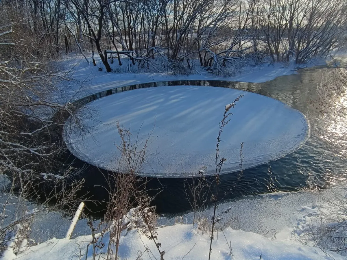 Отмечается, что это одно из наиболее редкий явлений в зимний период. Такие круги имеют идеально круглую форму и могут достигать диаметра в 10 метров. Встречаются они на озерах и реках с медленным течением. Точная причина возникновения подобного явления по-прежнему изучается учеными.