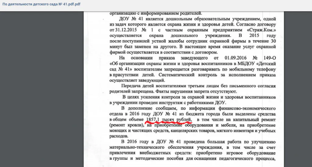 Мама воспитанницы детского сада №41 обратилась в городскую администрацию с просьбой разъяснить, правомерны ли поборы, которые ведутся в учреждении. Ранее мы уже публиковали жалобу рязанки, где она рассказывала о суммах, которые собирают с каждой семьи, к примеру, на натяжной потолок. В администрации города на обращение женщины отреагировали и сообщили, что садик имеет право привлекать дополнительные денежные средства, если они пожертвованы добровольно. Кроме того, в официальном ответе уточняется, что в этом году на детский сад №41 было выделено 1 857 100  рублей.