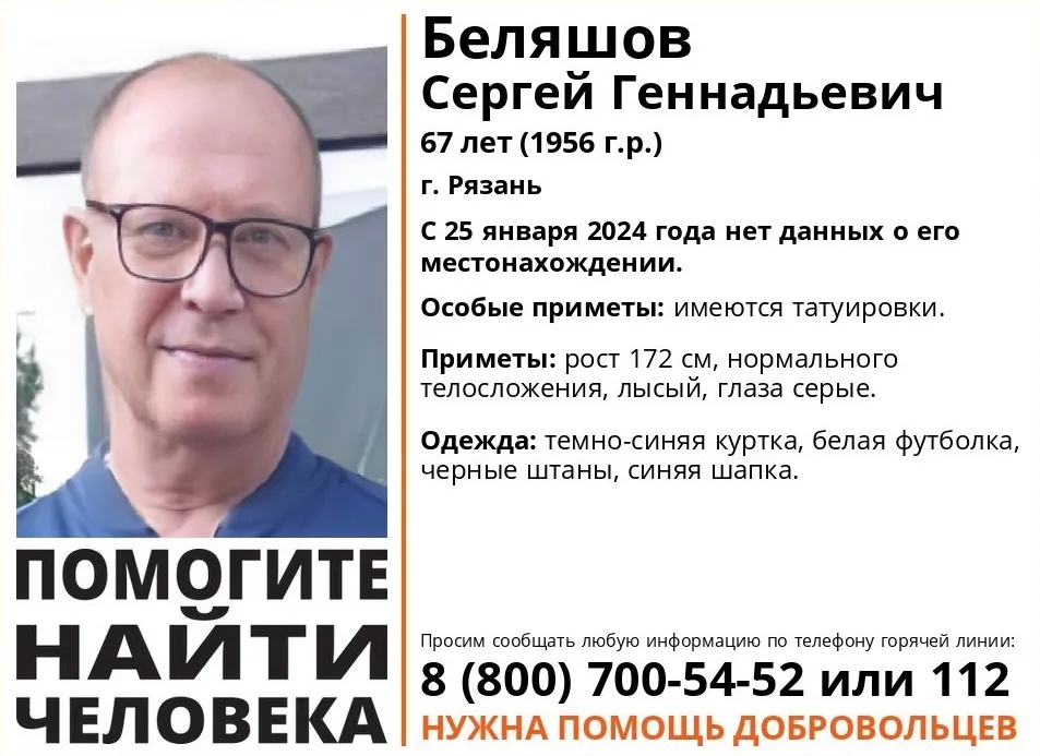 Жителей Рязанской области просят помочь в поисках 67-летнего рязанца Сергея Беляшова. Информации о местонахождении жителя Рязани нет с 25 января. Подробности сообщили волонтеры регионального поисково-спасательного отряда «Лиза Алерт».