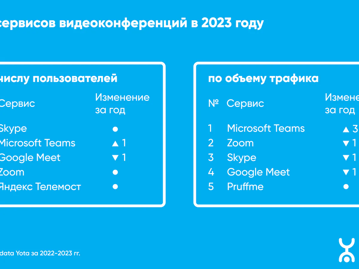 По итогам 2023 года Zoom потерял лидерство среди сервисов для видеоконференций: расход трафика внутри приложения снизился на 38% в сравнении с 2022 годом. Аналогичный спад демонстрирует Skype, где активность абонентов уменьшилась на 34%, а также Google Meet — падение на 30%. На первую строчку вырвался Microsoft Teams, он единственный среди иностранных сервисов этого сегмента показал значительный рост потребляемого трафика — в три раза.