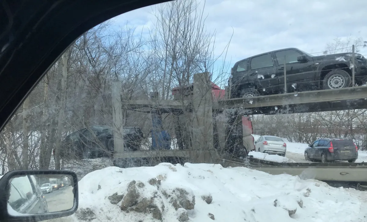 По словам свидетелей в сообществе «Подслушано у водителей Рязани», инцидент произошел около 14:30 в пятницу, 9 февраля, и вызвал небольшой затор. Судя по всему, машина перевозила «Лады».