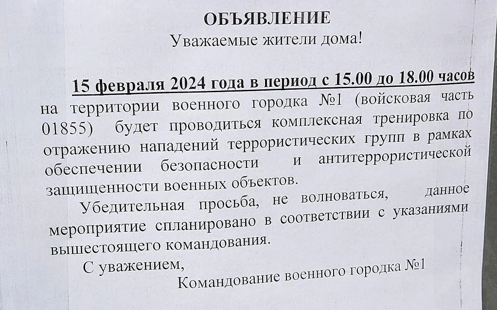 Судя по опубликованному фото объявления, учения состоятся в этот четверг, 15 февраля, в период с 15 до 18 часов вечера. Отмечается, что местных жителей убедительно просят не волноваться, в связи с тем, что тренировка проводится «в рамках обеспечения безопасности и антитеррористической защищенности военных объектов». Она была согласована с высшим командованием.