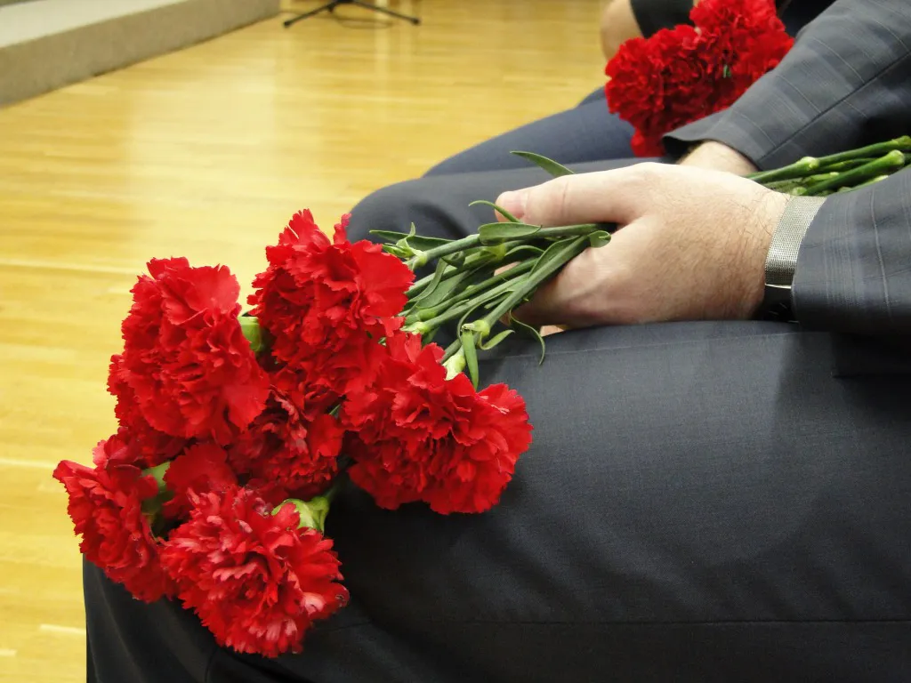 У сцены в рамках фамилии тех, кого потеряла страна, и красные гвоздики. Среди погибших пассажиров авиалайнера 68 музыкантов легендарного Ансамбля Александрова, который является одним из символов нашей страны.