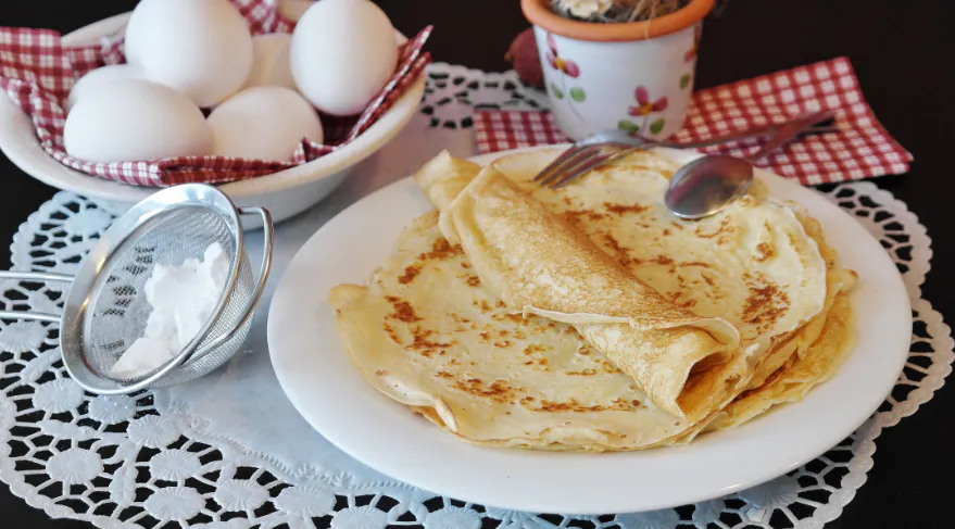 Первый из рекомендованных рецептов предлагает приготовление блинов на сливках. Для его реализации потребуется: литр подогретых сливок, 6 целых яиц, 6 желтков, мука по необходимости и 110 граммов топленого масла. Процесс приготовления предполагает тщательное взбивание яиц и желтков, постепенное добавление муки до получения жидкого теста, вливание подогретых сливок и перемешивание до исчезновения комков, а также введение топленого масла с последующим перемешиванием.