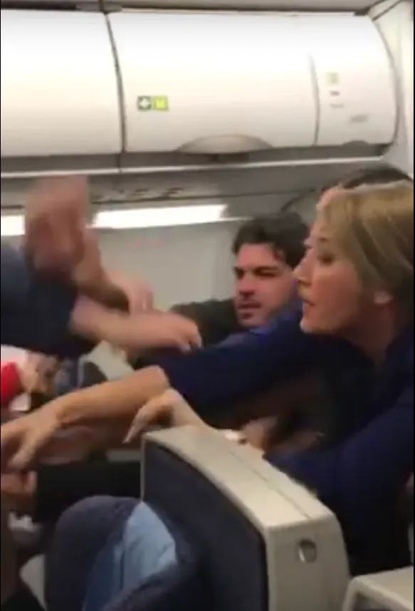 На записи видно, как пожилой мужчина наносит удар молодому человеку, после этого между ними завязывается драка. Другие пассажиры и экипаж самолета, в свою очередь, пытаются разнять дебоширов.