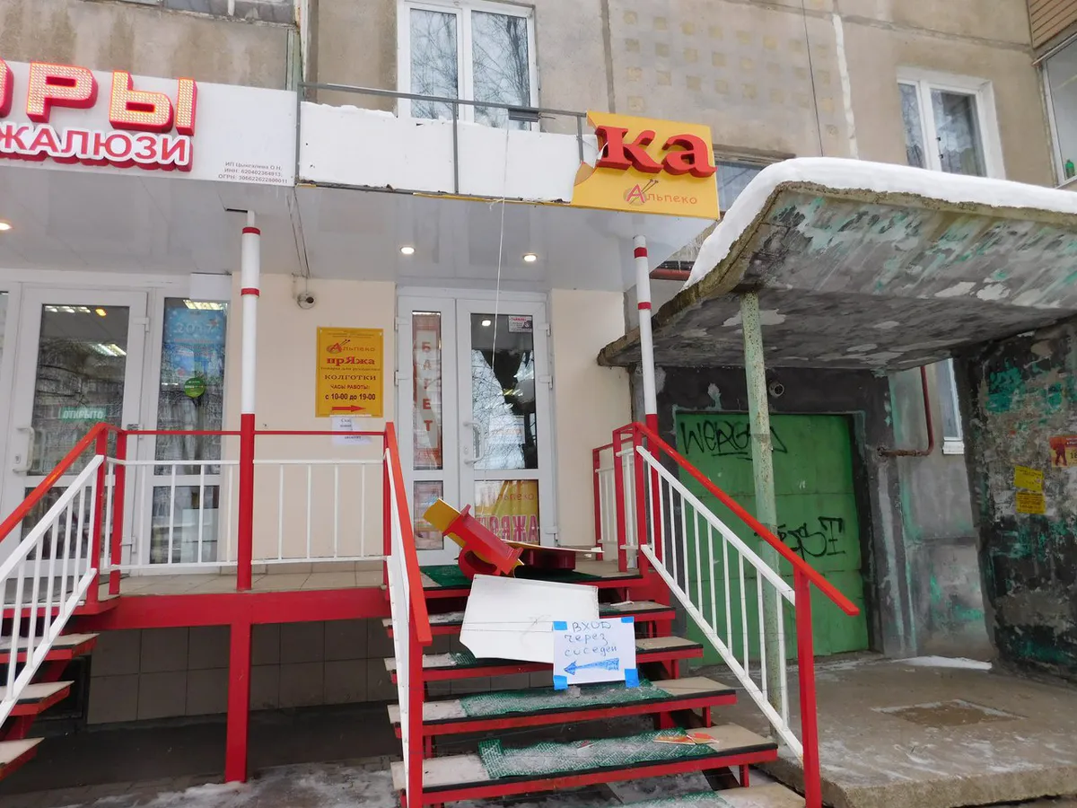 Народное фото: коммунальщики испортили вывеску магазина, сбивая сосульки