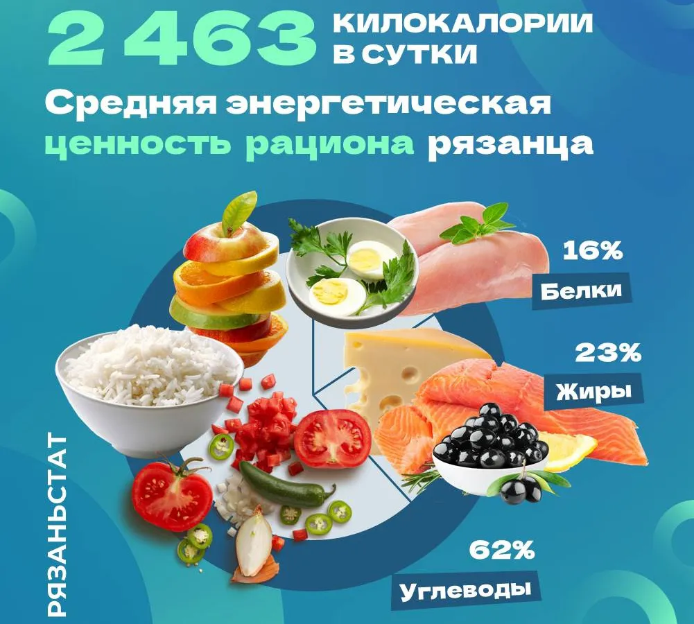 Статистические данные показывают, что за год среднестатистический житель Рязанской области потребляет 227 кг молочных продуктов, 113 кг мясных и рыбных продуктов, 263 яйца, 96 кг овощей, 60 кг фруктов и ягод, 86 кг изделий из муки и круп, 56 кг картофеля. С пищей жители региона получают около 2,5 тысячи калорий. Рекомендации Минздрава РФ составляют от 1,7 тыс до 3 тыс ккал в зависимости от вида деятельности.