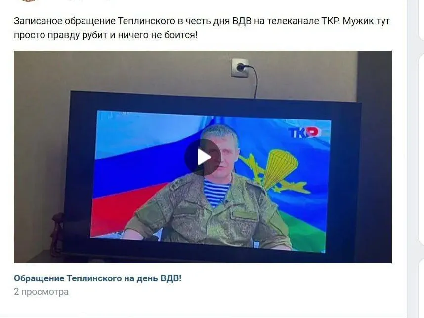 Ранее в Telegram-канале Минобороны РФ было опубликовано официальное поздравление Михаила Теплинского с Днем ВДВ. Впоследствии в соцсетях появилось видео, на котором человек, похожий на командующего, заявляет, что «мы зашли в тупик» и подал рапорт об отставке с должности командующего группировкой войск «Днепр». Видео было оформлено в стиле эфира телеканала ТКР.