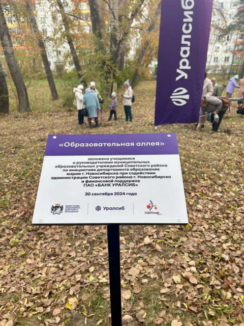 30 сентября в парке рядом с Домом молодежи «Маяк» в Советском районе Новосибирска состоялась торжественная церемония закладки «Образовательной аллеи», партнером которой выступил Банк Уралсиб. В мероприятии приняли участие педагоги-ветераны, руководители образовательных учреждений, учащиеся Советского района, а также сотрудники Банка Уралсиб. Силами собравшихся было высажено 35 лип, кроме того, уралсибовцы помогли отремонтировать скамейки парка и установить урны.