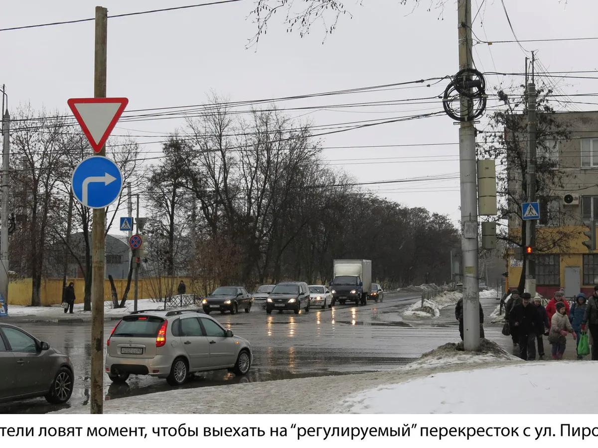 Анонимный пользователь группы ВКонтакте «Рязань» опубликовал фотографии перекрестка улицы Пирогова и проезда Шабулина. На нем установлены светофоры, но не по всем направлениям - по ул. Пирогова со стороны Приокского просто висит знак "Уступи дорогу".