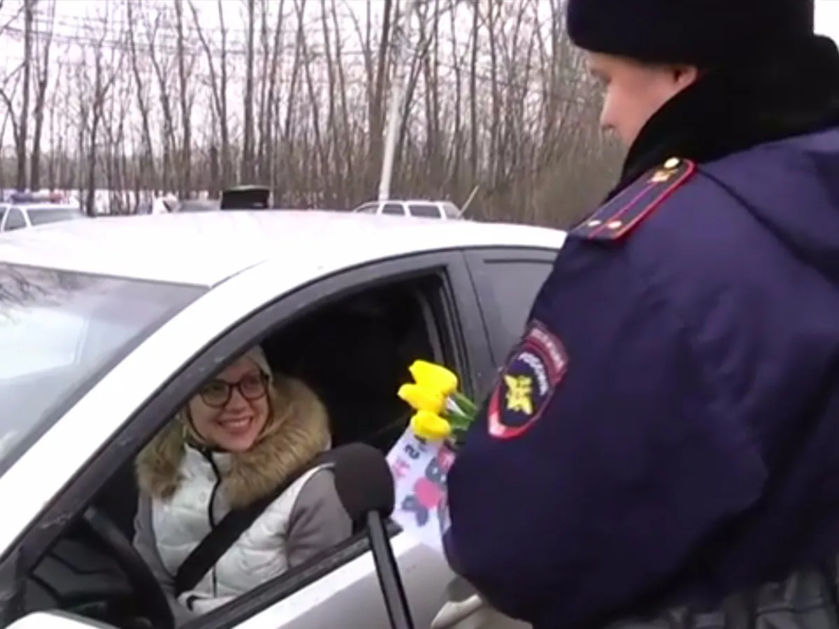 Букет от сотрудника ДПС - рязанских автомобилисток поздравили с 8 марта