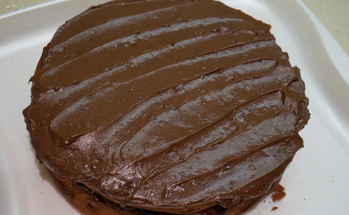 Для сборки торта первый корж помещается на сервировочное блюдо и промазывается кремом. Можно добавить нарезанный банан для разнообразия текстур и вкусов. После этого накладывается второй корж, и весь торт обмазывается кремом со всех сторон.