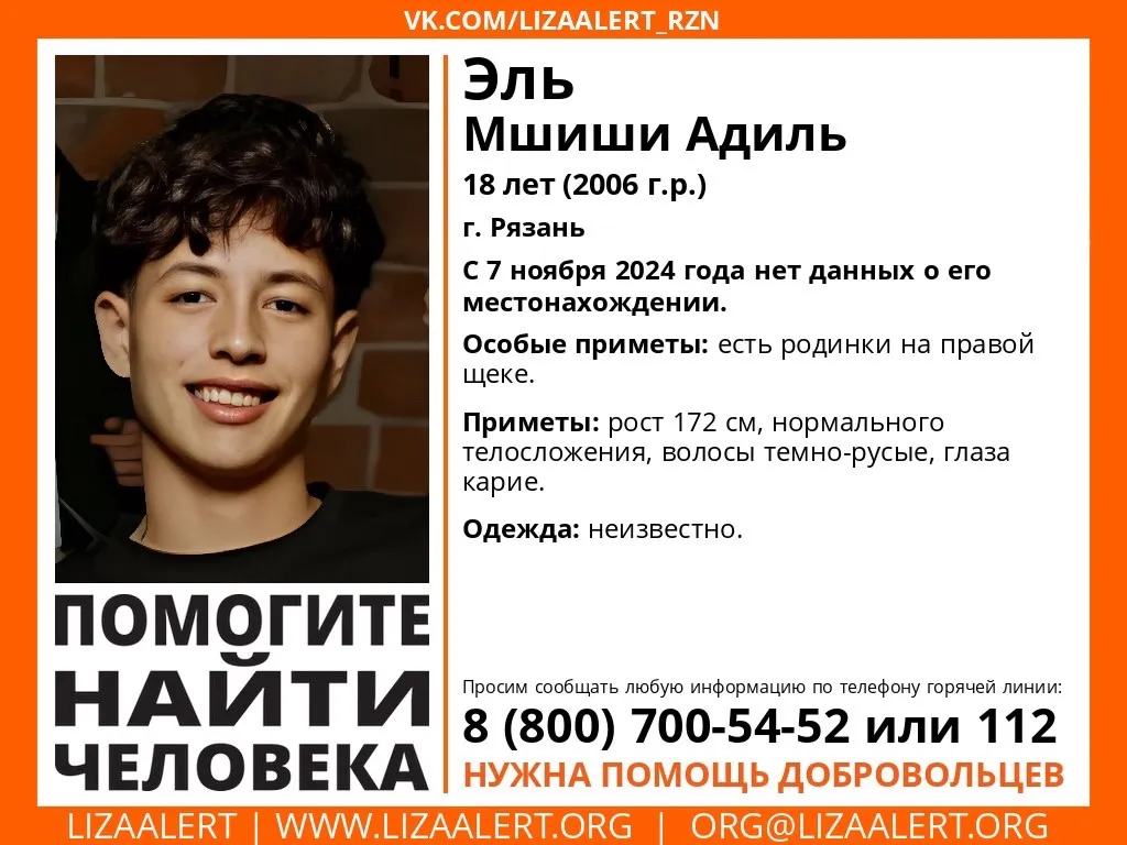 В Рязани идут поиски 18-летнего юноши. Иностранец Эль Мшиши Адиль пропал 7 ноября 2024 года. Пост с информацией о пропавшем появился 10 ноября 2024 года в официальном сообществе "ЛизаАлерт" ВКонтакте.