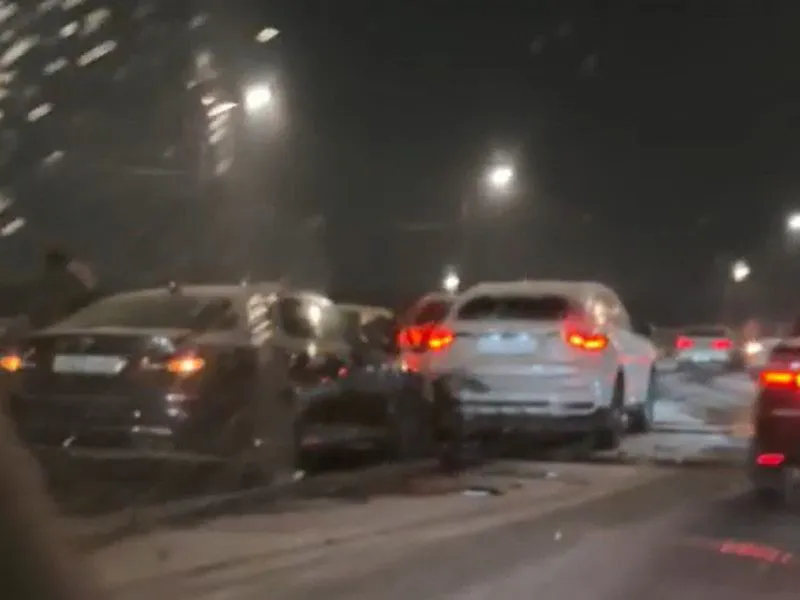 На записи видно, как на левой полосе дороги с включенными аварийными огнями стоят три группы автомобилей — в общей сложности 8 машин. Как минимум одна из них серьезно пострадала: капот автомобиля оказался сильно смят.