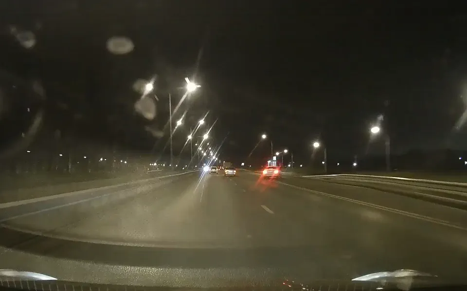 Авария случилась на Северной окружной дороге около шести часов вечера. На видео видно, как две машины движутся в одном направлении: в правом ряду находится такси, а в левом — легковой автомобиль с включенной аварийной сигнализацией. Внезапно легковушка из левого ряда резко перемещается вправо, что приводит к опасной ситуации. Таксист, пытаясь избежать столкновения, также уходит вправо и вылетает с полосы.