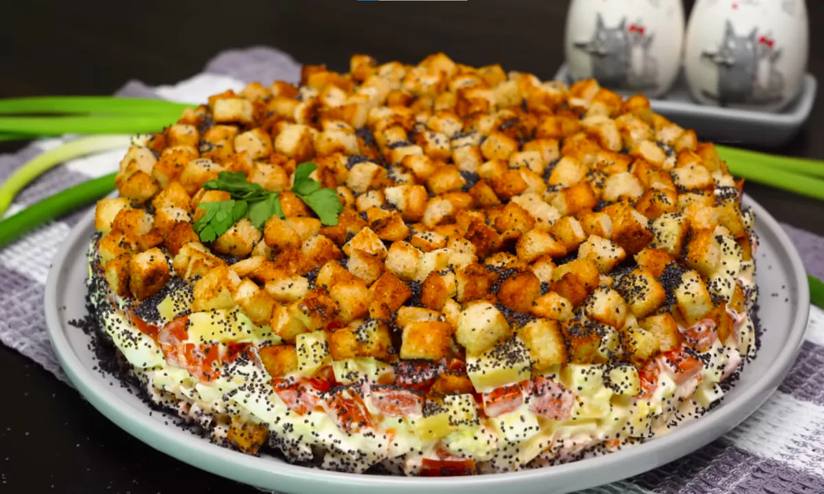 Для лучшего результата сухарики добавляйте непосредственно перед подачей, чтобы они не размокли. Такой салат станет ярким акцентом на праздничном столе или отличным вариантом для семейного ужина.
