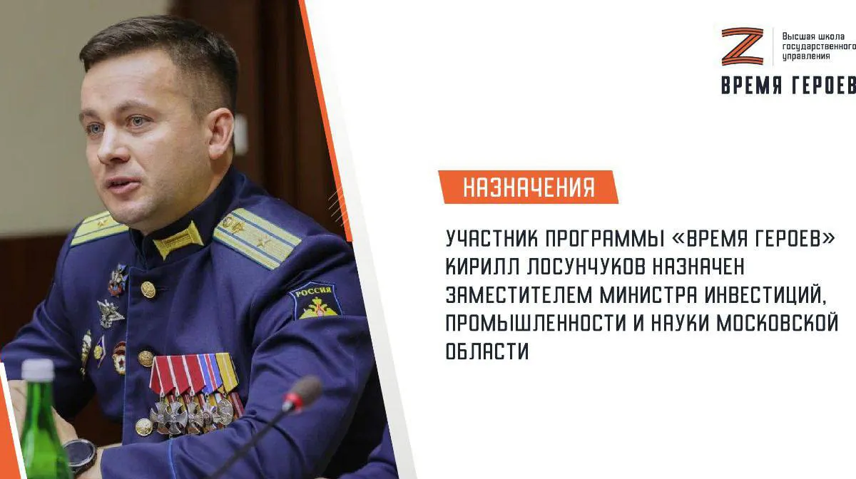 Сегодня представители Всероссийской ассоциации развития местного самоуправления сообщили в своем Telegram-канале, что участник программы «Время героев» Кирилл Лосунчуков стал заместителем министра инвестиций, промышленности и науки Московской области. В ВАРМСУ также сообщили, что Лосунчуков — трижды кавалер ордена Мужества и участник специальной военной операции.