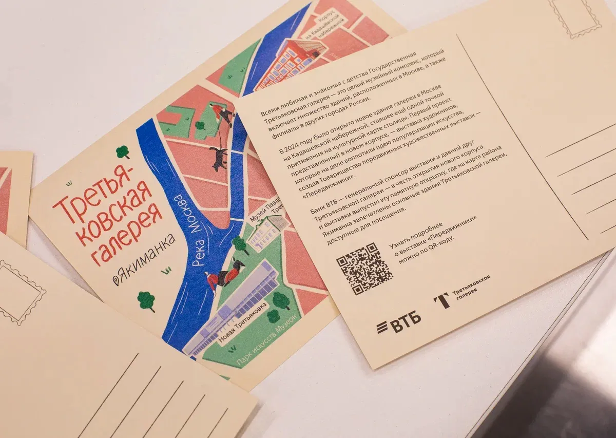 Одна тысяча памятных открыток будет отправлена в 500 ведущих художественных галерей и наиболее крупных музеев из 52 стран мира и в 500 средств массовой информации, работающих в 107 странах, как символ значимости непрекращающегося культурного диалога с Россией в международном пространстве. Такую акцию запустили ВТБ и Государственная Третьяковская галерея. Акция приуроченную к выставке «Передвижники» и открытию нового корпуса музея на Кадашевской набережной в Москве.