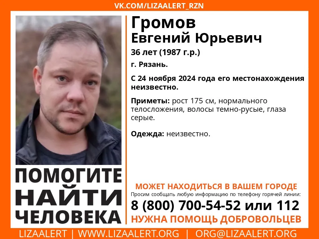24 ноября в Рязани пропал без вести 36-летний Евгений Громов. Его поисками, помимо полиции, занимаются волонтеры поисково-спасательного отряда «Лиза Алерт». Ориентировку с фото и описанием мужчины они опубликовали в соцсетях.