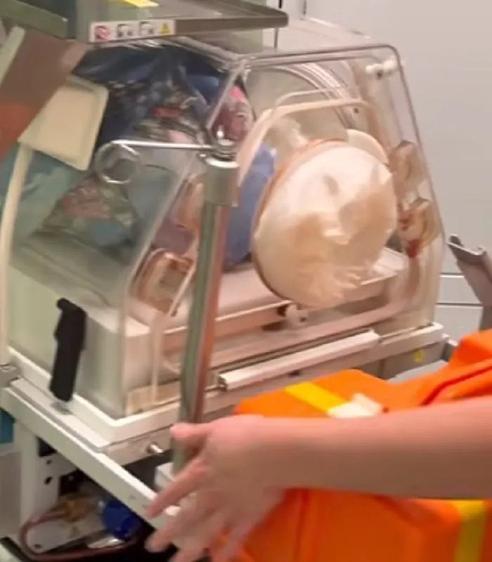 На фото видно процесс перевозки младенца, рожденного на 33-й неделе беременности с весом 1900 граммов, из операционной в реанимационное отделение.
