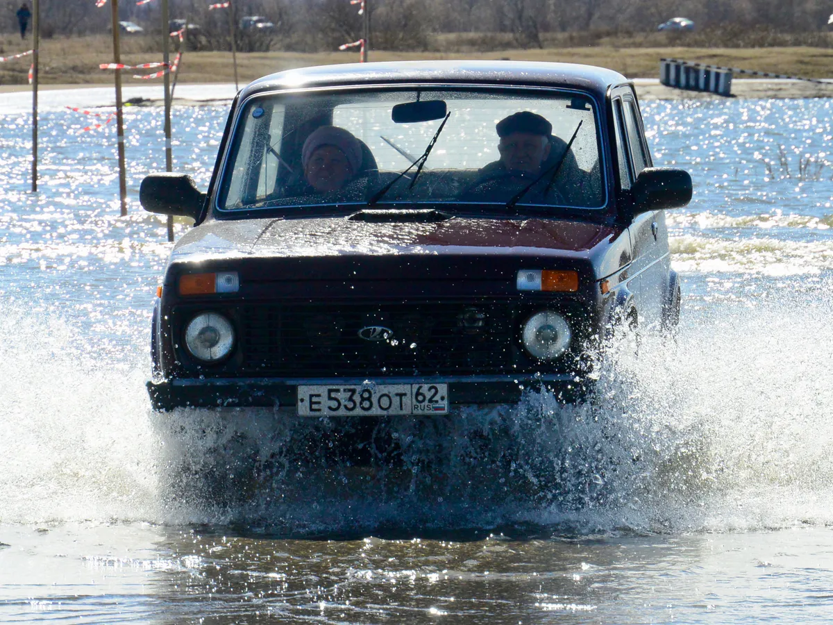 Правда, номинальное перекрытие не останавливает рискованных рязанцев - водители спокойно огибают препятствие и погружаются в воду. Глубина брода составляет 25-30 сантиметров, но в некоторых местах 300-метрового участка явно глубже. Такие автомобили как Нива, осложнений не испытывают, а вот низкие седаны толкают перед собой целую стену воды с риском залить мотор.
