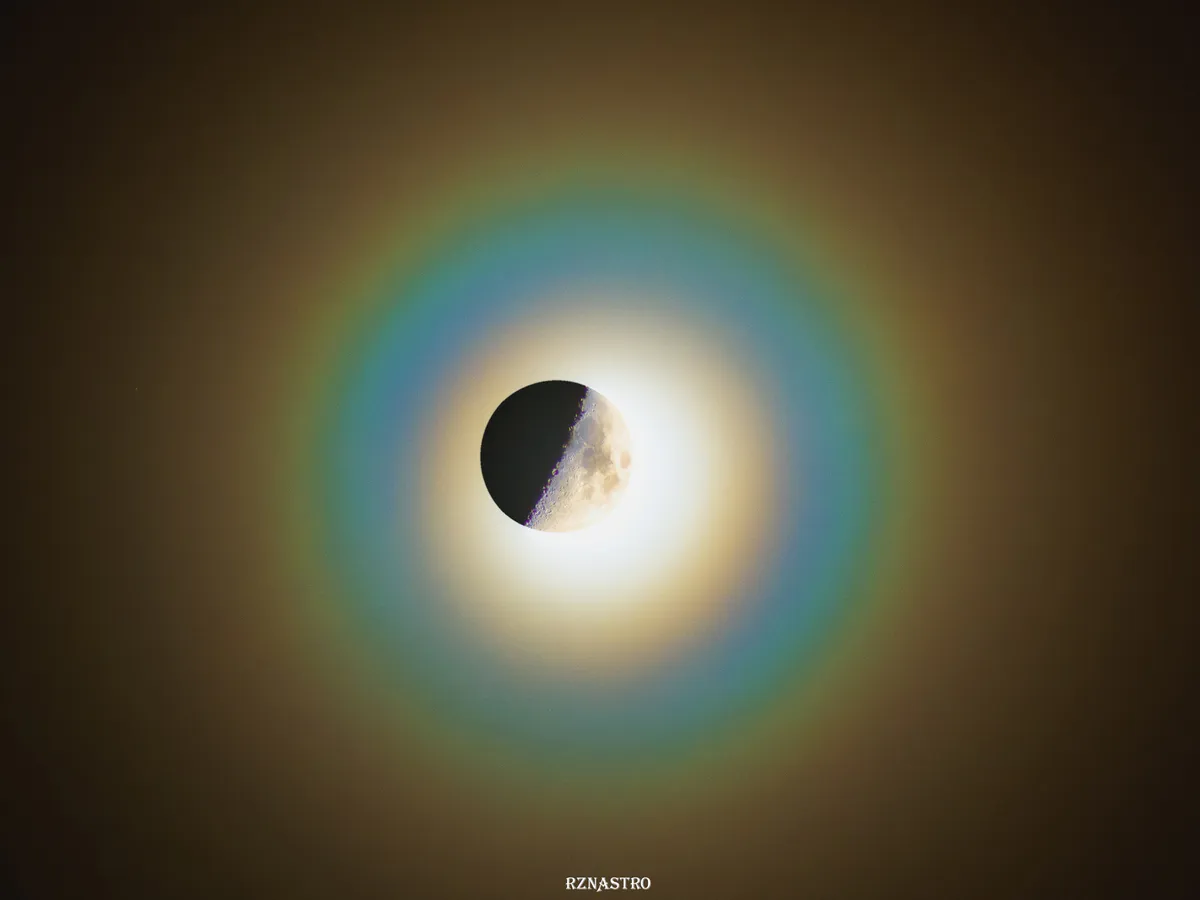 «Радужный ореол возникает из-за преломления света в тонких облаках, проплывающих перед Луной. Но естественный спутник Земли не находится в центре композиции», – отметили авторы публикации.