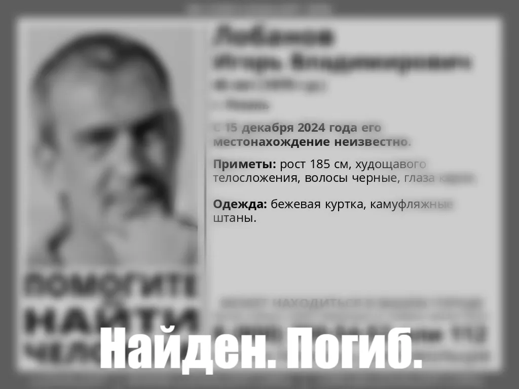 15 декабря в Рязани пропал без вести 45-летний Игорь Лобанов. Его поисками, помимо полиции, занимались волонтеры поисково-спасательного отряда «Лиза Алерт». Вчера близкие мужчины сообщили о его гибели. Сегодня эту информацию подтвердили и в ПСО «Лиза Алерт»: «Найден, погиб». О причине смерти горожанина ничего не известно.