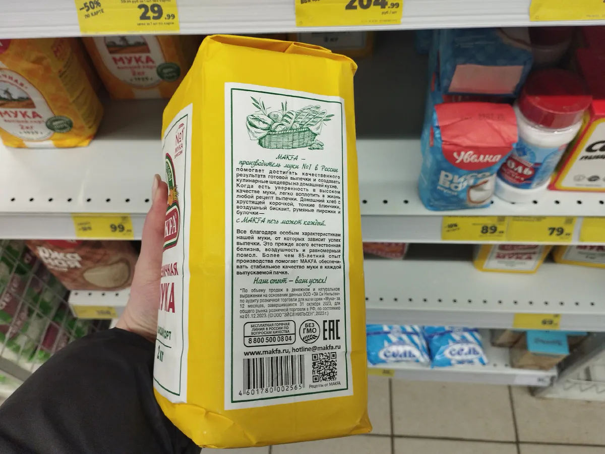 — «Сокольническая». На упаковке — высший сорт, по факту — не тянет. Ни по клейковине, ни по помолу.