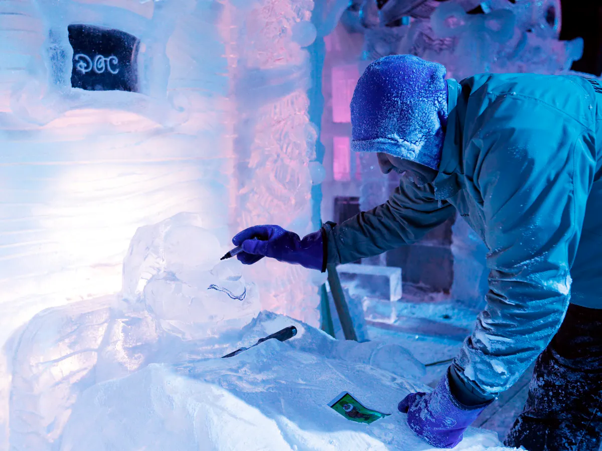 Николай Маныкин работает со льдом больше десяти лет. Его рабочий инструмент весит более пяти килограммов: работать приходится аккуратно, лишнее движение может непоправимо испортит ледяную статую.
