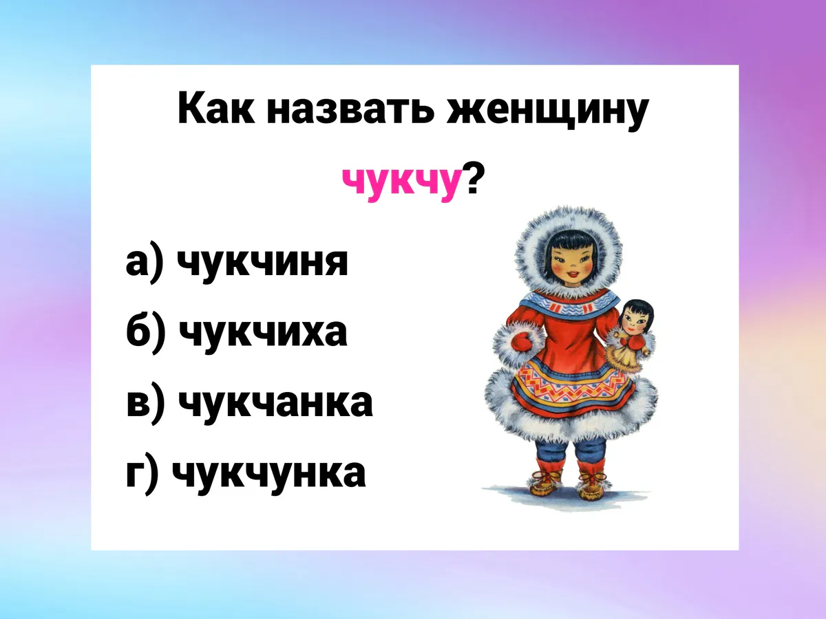 Кто такие чукчи — вопрос простой. А вот как назвать женщину этого народа? Варианты кажутся забавными: чукчиня, чукчиха, чукчанка, чукчунка. Казалось бы, логично добавить к слову стандартные суффиксы, как в «татарка» или «якутка». Но русский язык любит исключения.