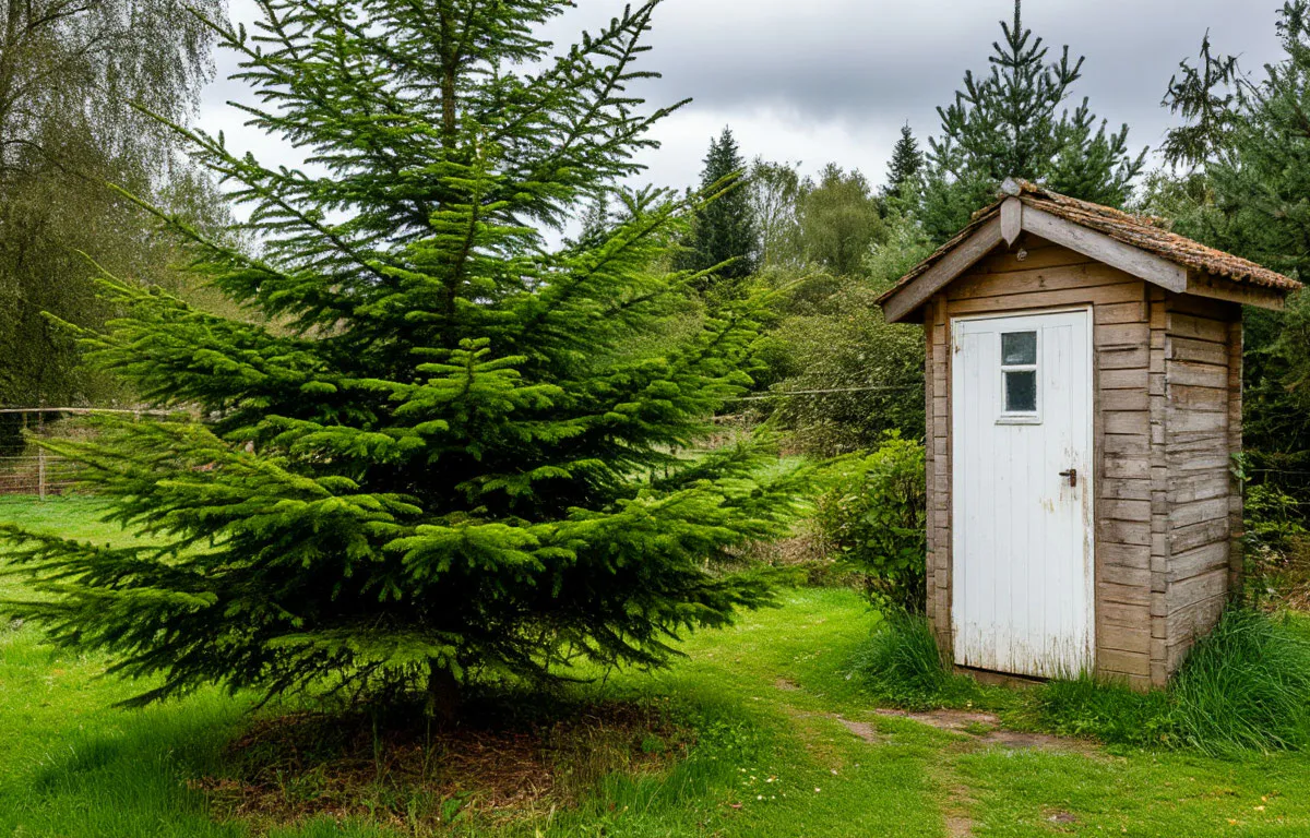 Ель — фаворит в борьбе с сыростью. За сутки одно дерево «вытягивает» до 300 л воды, а её корни охватывают радиус 7–12 метров. Сажайте её на расстоянии 5–7 метров от септика, чтобы корни не повредили коммуникации. Через 5–7 лет, когда ель подрастёт, участок станет заметно суше. Плюс — хвоя создаёт природный дренаж, а зимой дерево украсит двор.