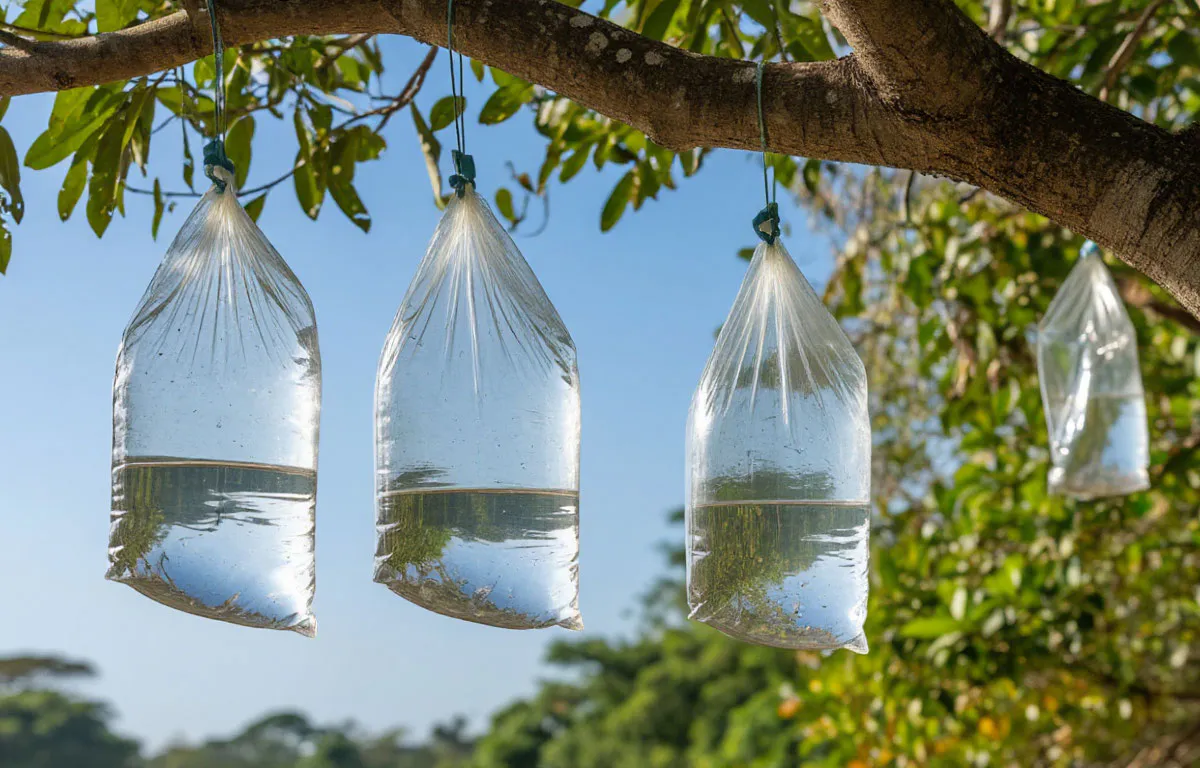Правила простые, но важные. Для начала лучше взять прозрачные пакеты — они ловят и преломляют свет намного лучше, чем цветные. Наполнять их стоит примерно наполовину: слишком тяжёлый пакет рискует сломать ветку, слишком лёгкий — не создаст нужного эффекта. Вешать лучше на уровне кроны, чтобы свет отражался именно там, где прячутся вредители. Воду менять надо раз в пару недель, иначе в пакетах заведутся свои маленькие жители.