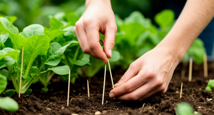 Втыкаем: Берем сухую зубочистку и воткните ее в землю на глубину 8-10 см. Важно сделать это в зоне активного полива, но не прямо у стебля, а в 15-20 см от него.