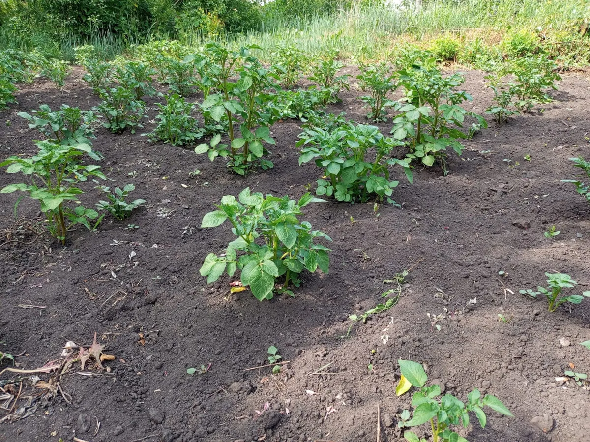 При первых цветках на картофеле — обязательно: прохожусь по ботве опрыскивателем — и клубни распирают землю