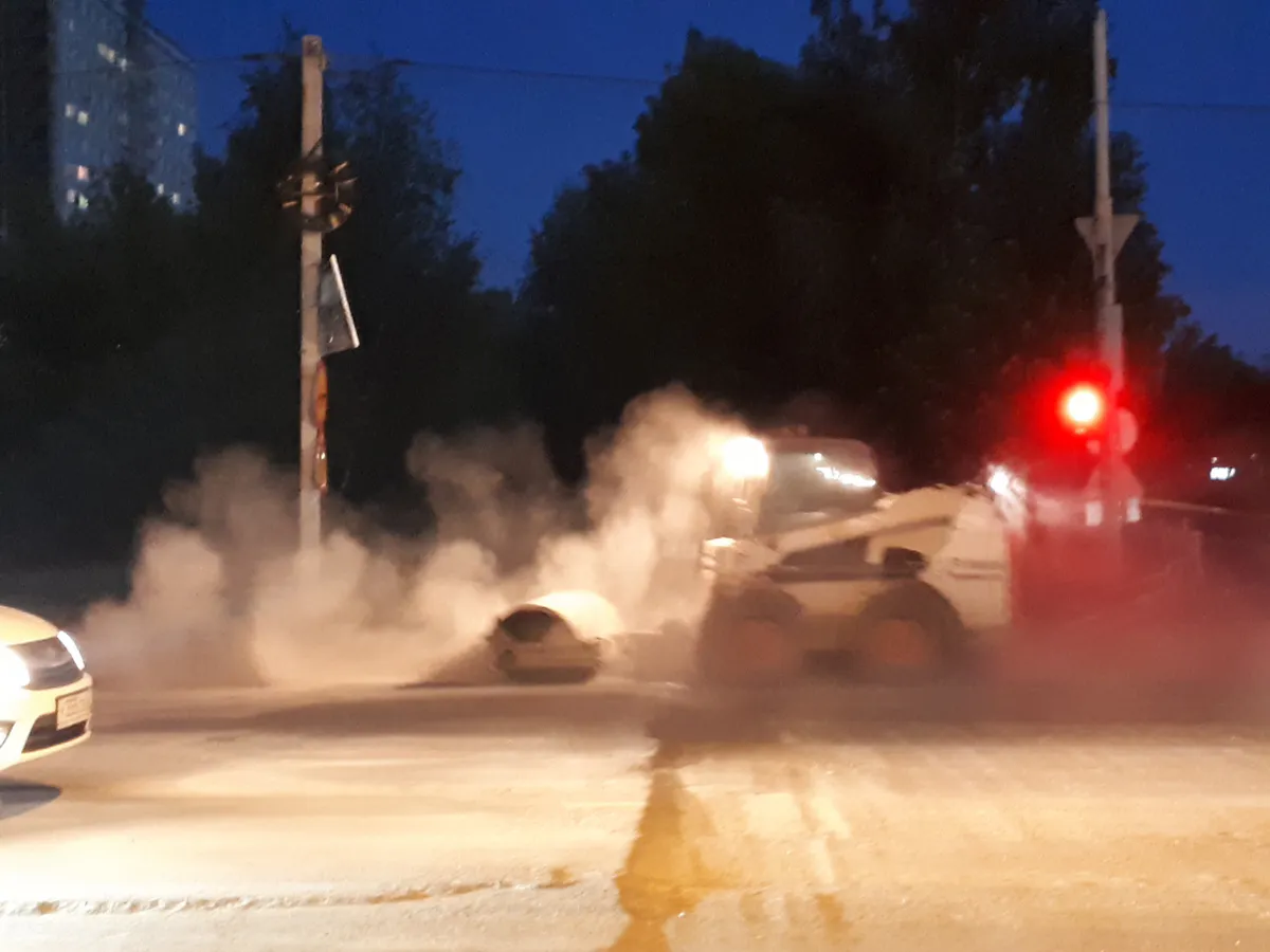 Издалека увидел столб белого тумана. Сначала подумал, что где-то авария на теплотрассе, и это густой дым. Подошел поближе, и увидел причину – видимо, это какой-то креативный способ чистить дороги. От пыли, поднятой вверх, практически невозможно было дышать, а автомобили, за время, пока стояли на переходе покрывались толстым слоем грязи. Тяжелее всего было пешеходам, которые стояли прямо перед пешеходным переходом по улице Большой, и попали в самый эпицентр этого пыльного облака.