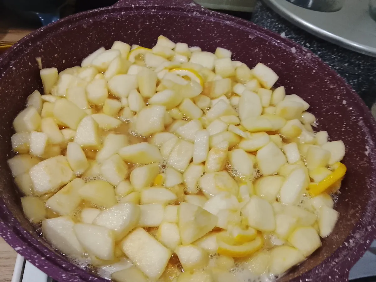 Сначала необходимо почистить порезать на кубики яблоки, желательно кисло-сладких сортов. Затем следует сварить сироп из 0,7 сахара и полутора литров воды с учетом на килограмм яблок. Затем запускаем нарезанные кубики в сироп и выдерживаем не менее трех часов. после чего доводим до кипения и варим 5-7 минут.
