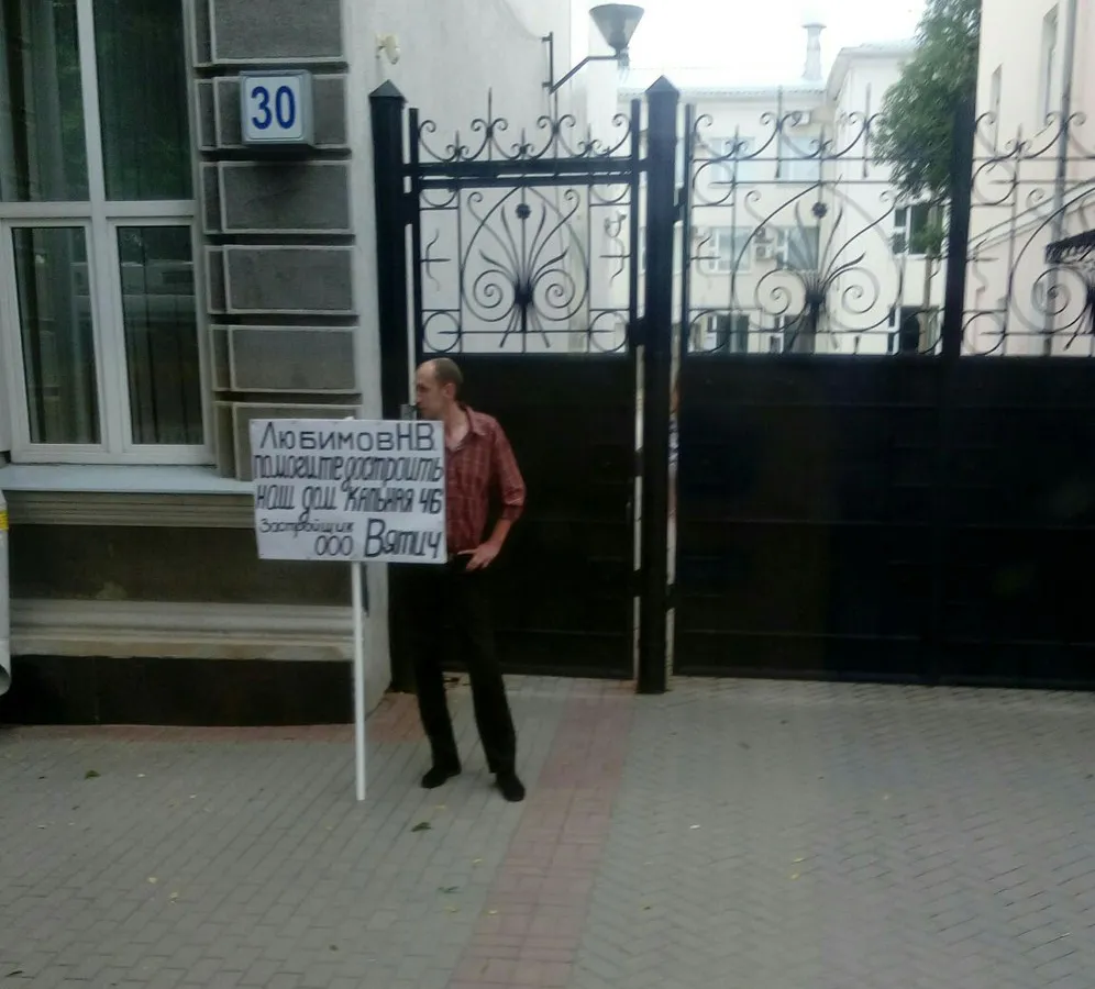 Утром, 5 июля, у здания правительства Рязанской области состоялся одиночный пикет. Дольщик долгостроя по адресу Кальная, дом 46 вышел с плакатом, на котором написано обращение к врио губернатора Николаю Любимову.